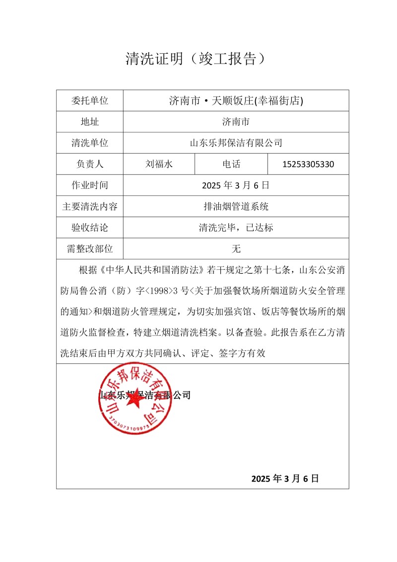 濟(jì)南市·天順飯莊(幸福街店)清洗報(bào)告25.3.6