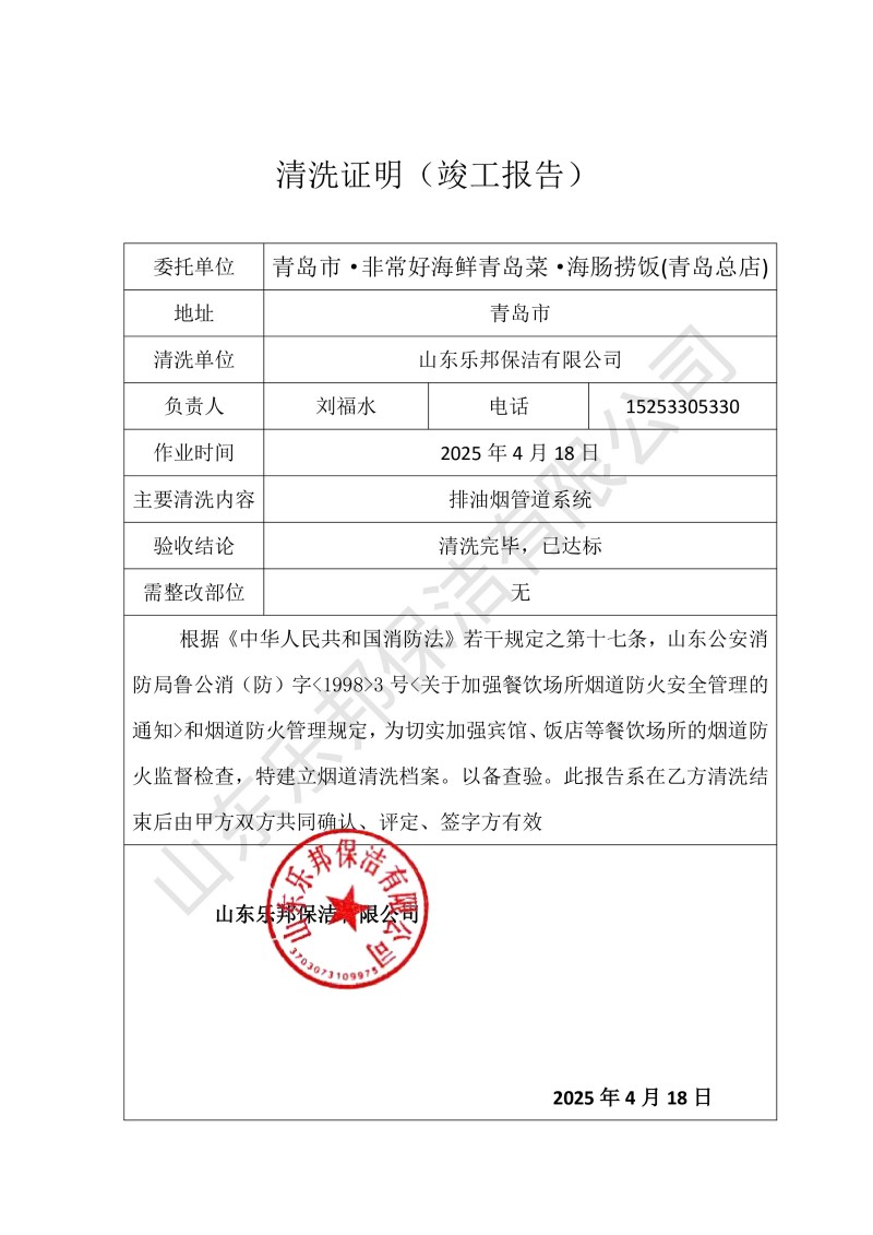 青島市·非常好海鮮青島菜·海腸撈飯(青島總店)清洗報(bào)告25.4.18