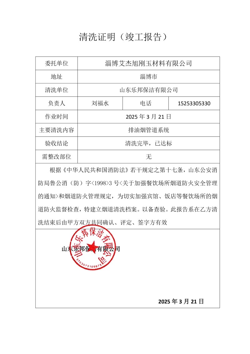淄博艾杰旭剛玉材料有限公司清洗報告25.3.22