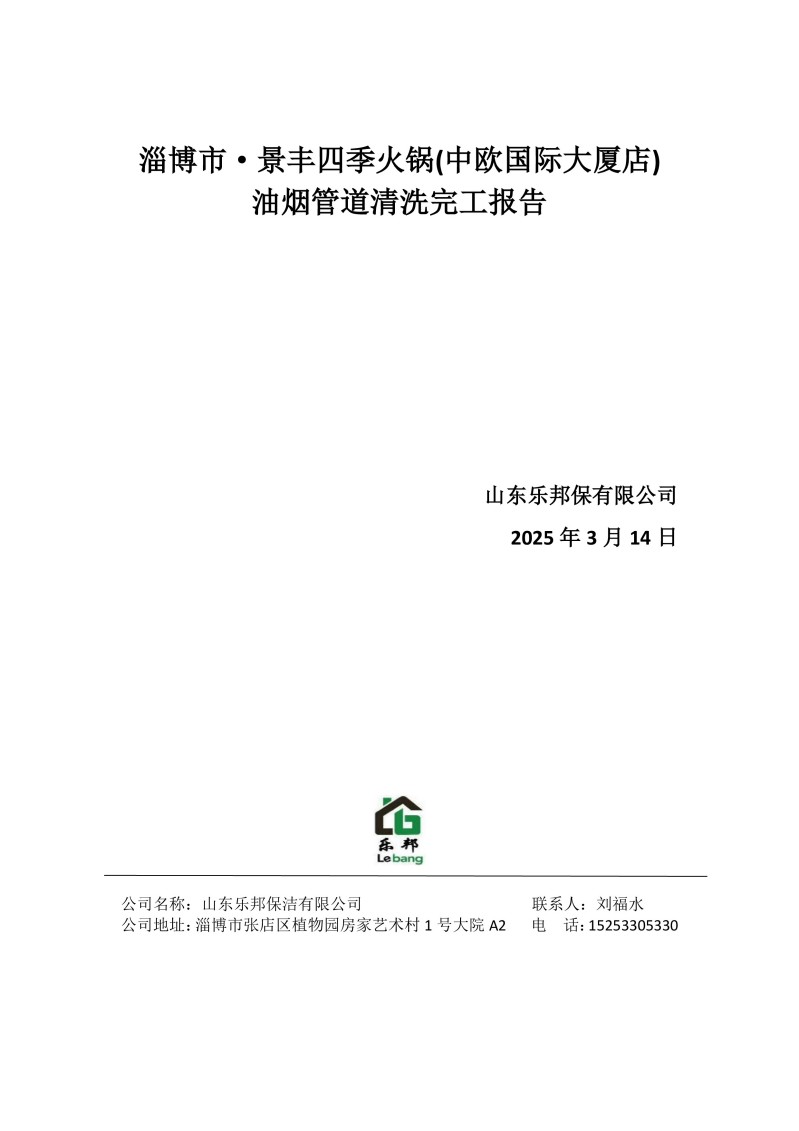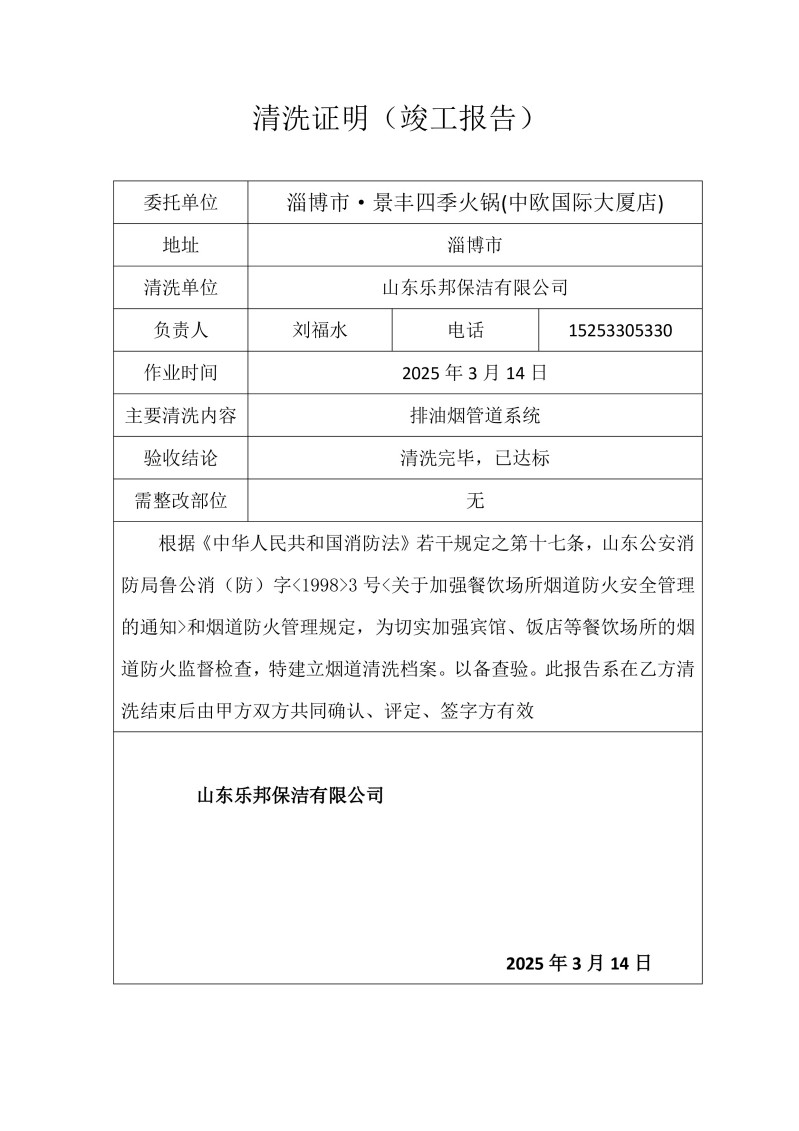 淄博市·景豐四季火鍋·融合菜(盛湖路店)清洗報(bào)告25.3.13