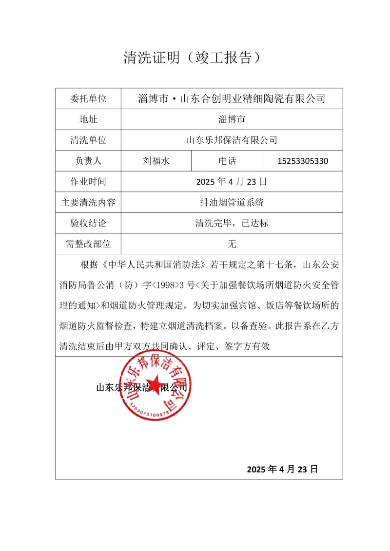 淄博市·山東合創(chuàng)明業(yè)精細(xì)陶瓷有限公司清洗報(bào)告25.4.23